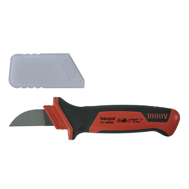 HAUPA 200000 kabelių peilis VDE yra profesionalus įrankis skirtas saugiam laidų, kabelių pjovimui ir izoliacijos nuėmimui elektros montavimo darbuose. Turi tiesią ir tvirtą 50 mm peilio geležtę bei ergonomišką, smūgiams atsparų plastikinį korpusą su apsauga geležtei, užtikrinant kokybišką ir saugų naudojimą iki 1000 V.