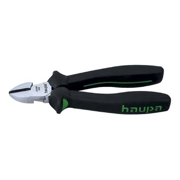 HAUPA 210068 šoninės replės DIN ISO 5749 su grūdintais pjovimo kraštais ir 2 komponentų rankenomis, skirtos tiksliam minkštos ir kietos vielos pjovimui profesionaliuose darbuose.