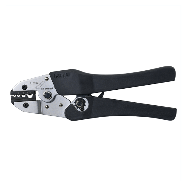 HAUPA 210764 presavimo replės skirtos 1,5–10 mm² neizoliuotų kabelių antgalių ir jungčių presavimui. Mechaninis veikimas, reguliuojamas presavimo slėgis ir fiksavimo mechanizmas užtikrina patikimą bei tikslų sujungimą.