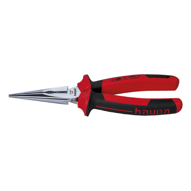 HAUPA VDE ilgos siauros replės DIN ISO 5745 su šoniniu pjovikliu skirtos saugiam darbui iki 1000 V. Tiesios, 200 mm ilgio replės pagamintos iš C45 plieno, su grūdintais pjovimo kraštais, tinka minkštos ir kietos vielos darbams.