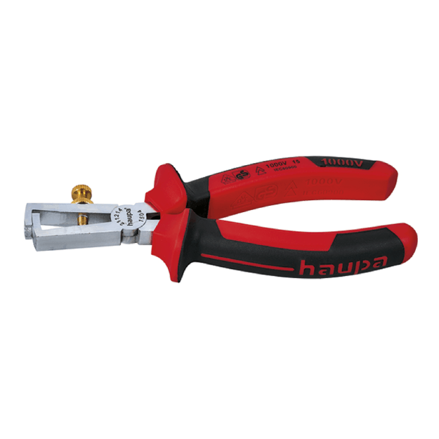 HAUPA VDE laidų izoliacijos nuėmimo replės skirtos saugiam darbui iki 1000 V ir laidams Ø 0,2–6 mm. Pagamintos iš C45 plieno, su spyruokle ir reguliavimo varžtu, leidžia tiksliai ir patogiai nuimti izoliaciją elektros montavimo darbuose.