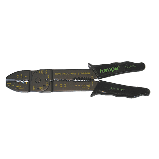 HAUPA 210808 presavimo replės skirtos 1,5–6 mm² kabelių ir jungčių presavimui. Mechaninis veikimas ir ovalinė presavimo forma užtikrina patikimą bei tolygų suspaudimą įvairiems elektros montavimo darbams.