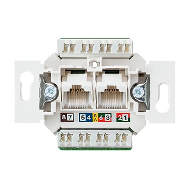 JUNG UAE 8-8 UPO K6 US – dvigubas Cat.6 kompiuterinis lizdas, 2 x RJ45, neekranuotas, tinkamas patikimam tinklo įrenginių sujungimui.