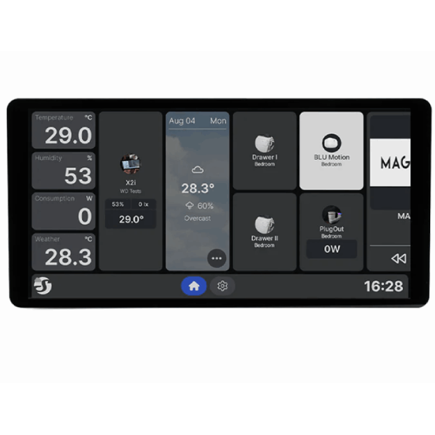 Shelly Wall Display X2i – modernus išmanių namų valdymo ekranas su 6.9” lietimui jautriu spalvotu ekranu, skirtas patogiam apšvietimo, įrenginių ir scenarijų valdymui vienoje vietoje. Įrenginys montuojamas vietoje įprasto jungiklio ir turi integruotą relę vienos apkrovos valdymui.