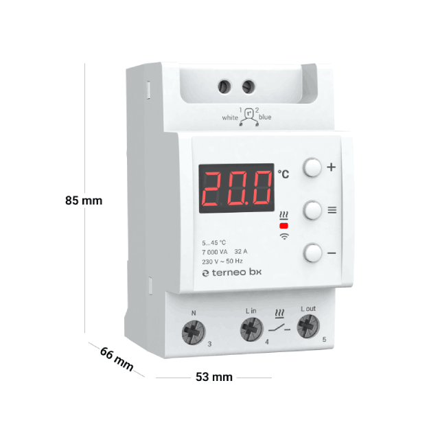 terneo bx – galingas Wi-Fi termostatas, skirtas grindinio šildymo valdymui iki 7000 VA, montuojamas DIN bėgyje elektros skydelyje. Valdymas atliekamas per terneo programėlę arba my.terneo platformą, todėl temperatūrą galite reguliuoti iš bet kurios vietos.